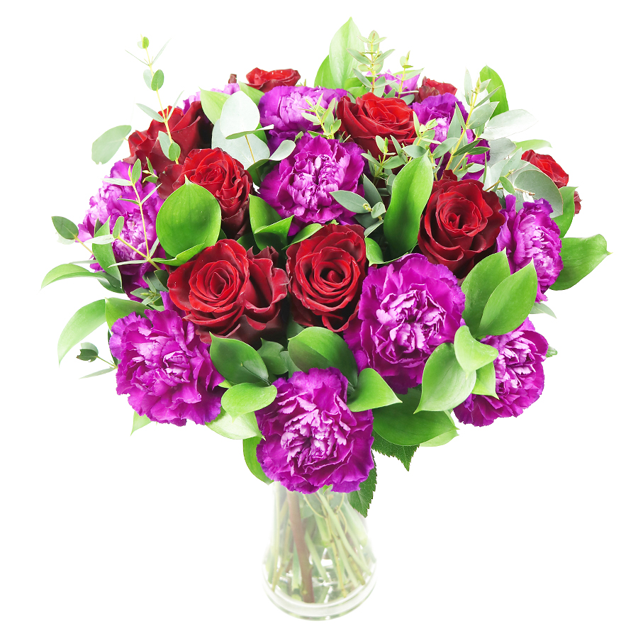 Show your deepest affections with our Elegant Passion Bouquet, featuring a harmonious blend of red roses, cerise carnations, lush ruscus, and fragrant eucalyptus. This bouquet is meticulously designed to embody love and elegance.