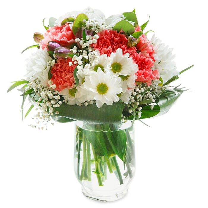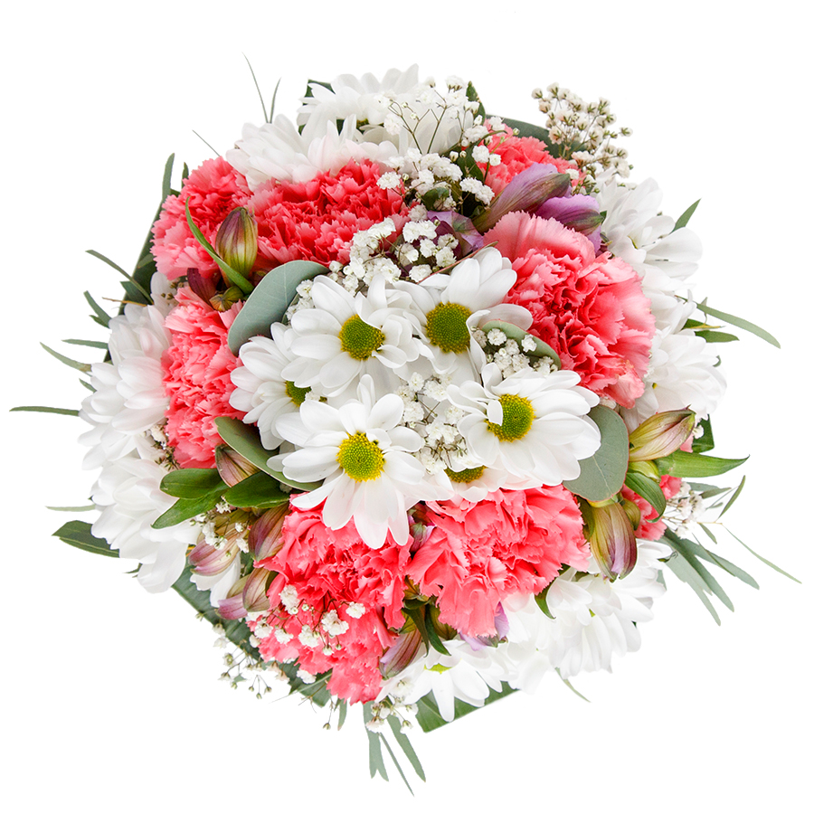 Delight in the exquisite beauty of our seasonal flower arrangement, designed to bring joy and elegance to any occasion. This bouquet showcases a harmonious blend of snow-white chrysanthemums, airy gypsophila, and soft pink carnations, all elegantly wrapped in lush aspidistra leaves.